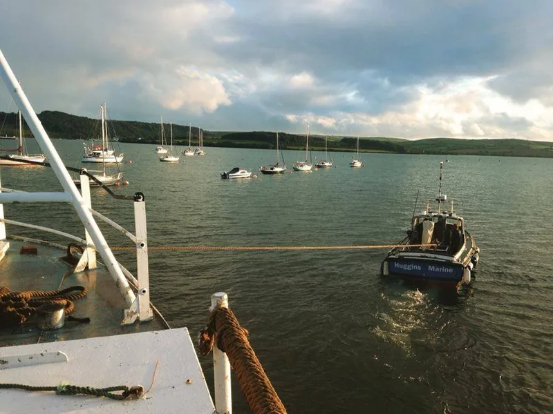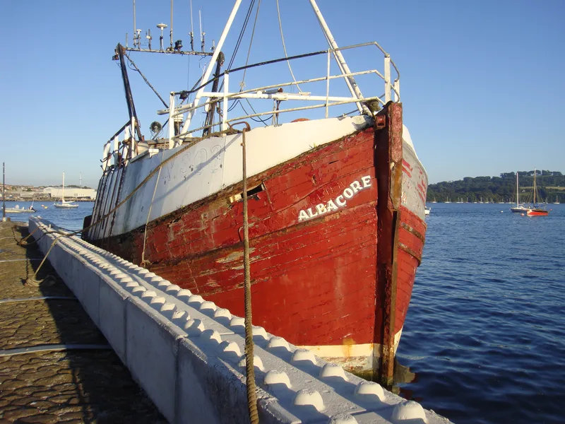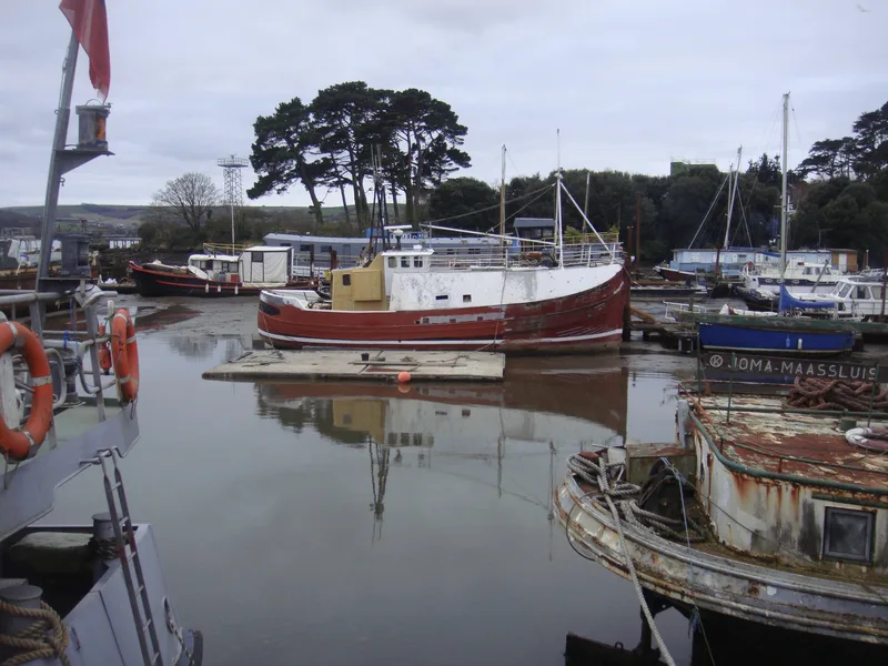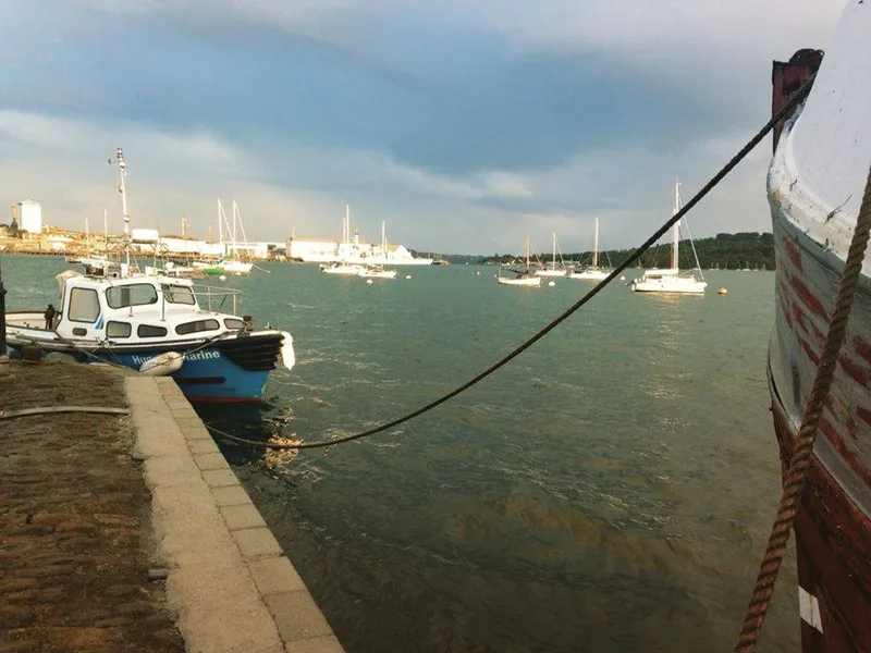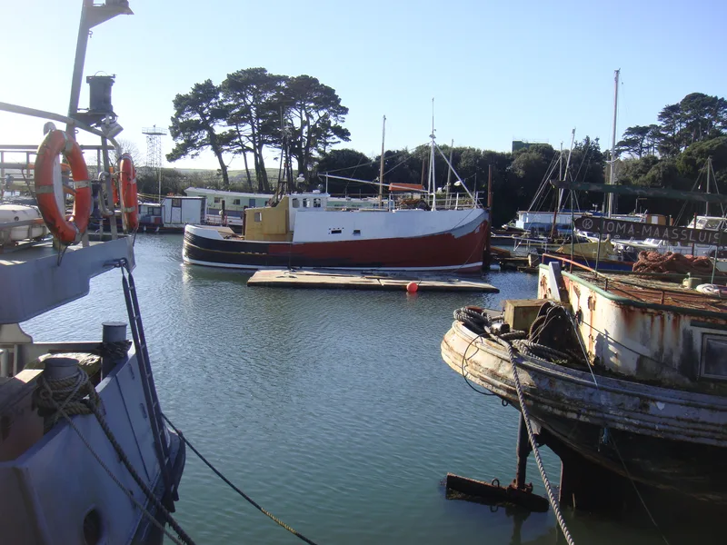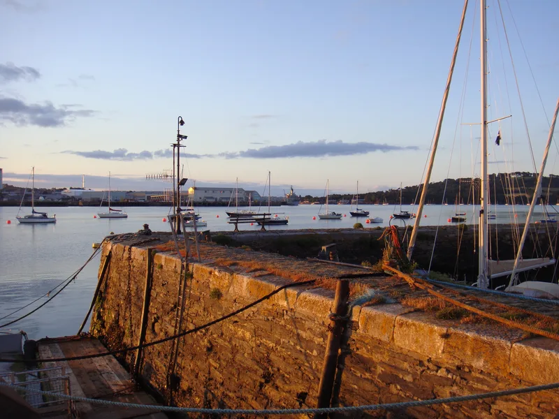 The solution, when it came, was brilliant but not altogether simple: First, we had to wait for a really high tide as the boatyard where we were moored was in a tidal estuary and Albacore actually spent large parts of her day sitting in mud. We then had to have one of the guys from the yard tow us out of there on a rope line as we no longer had a working engine. And then, about a mile or so up the river near to where the Torpoint Ferry runs to and from Plymouth, we were deposited next to the huge outer wall of the historic Ballast Pond.