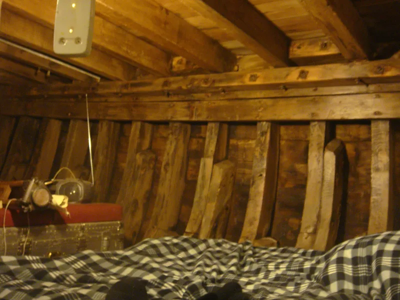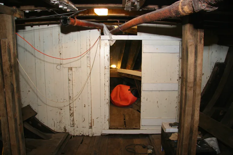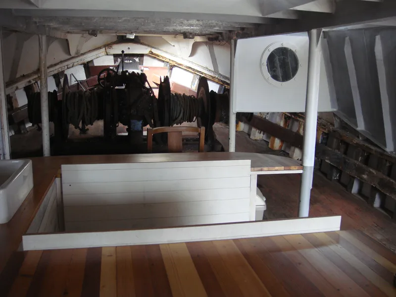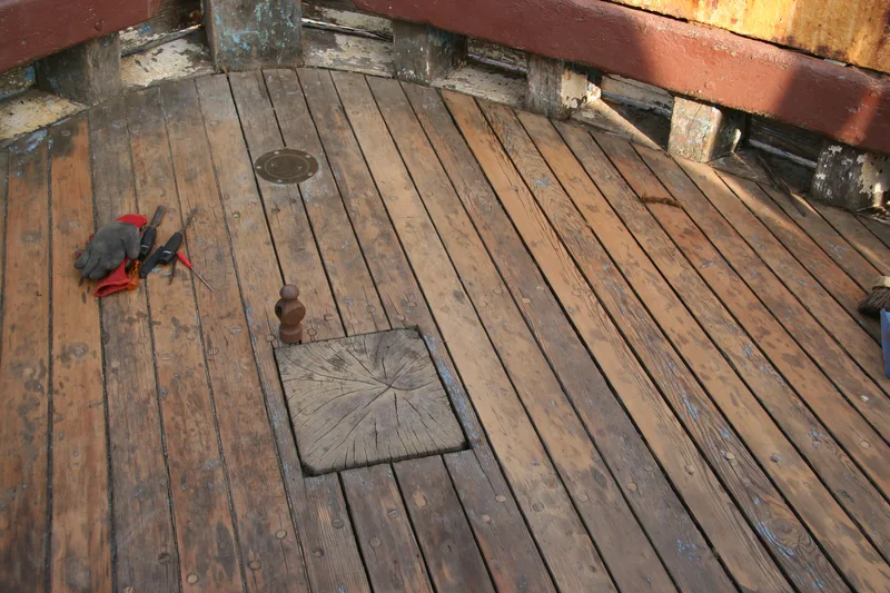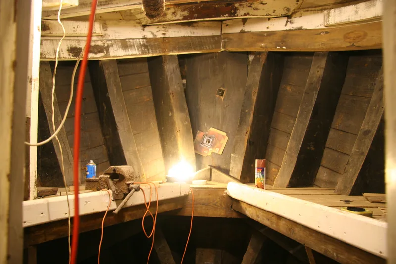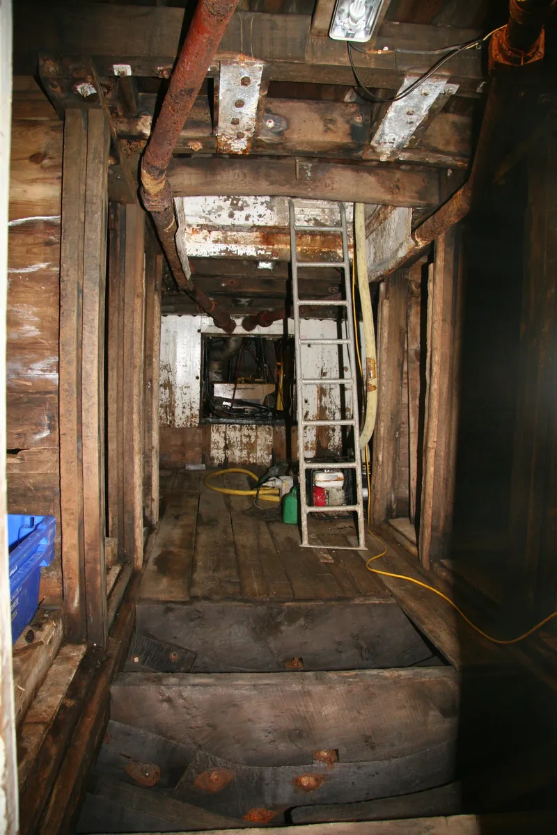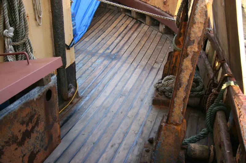 The old fish hold, in particular, underwent a lot of work: After the cleaning and the sanding, Tim removed the old metal pipes, emptying them of oil and sealing off the ends. He then treated and waxed all of the wood using a beeswax which he made up himself from the raw ingredients. It smelled amazing after that! He then spent most of the summer working on the upper decks which had a habit of leaking water in to the old bunk room below, an unfortunate fact which he had been forced to endure from one of the bunk beds all through that previous winter! He used traditional methods and materials to caulk the seams with oakum and tar, the smell of which can still transport me back to that summer in an instant.