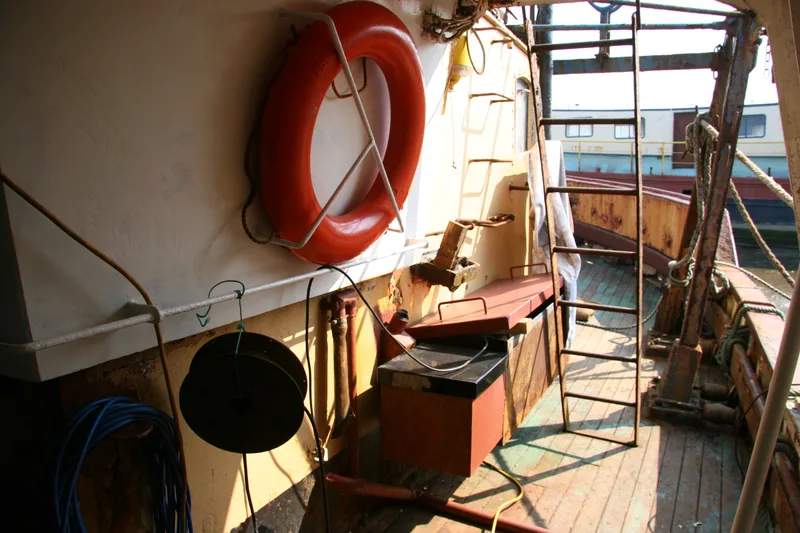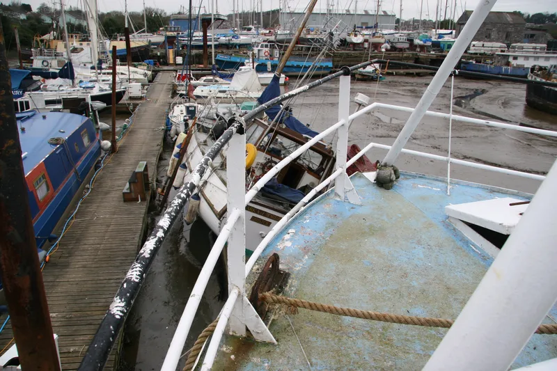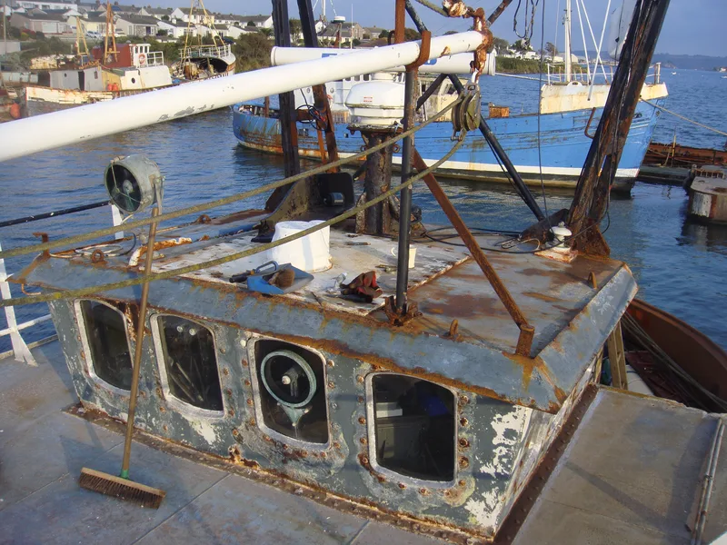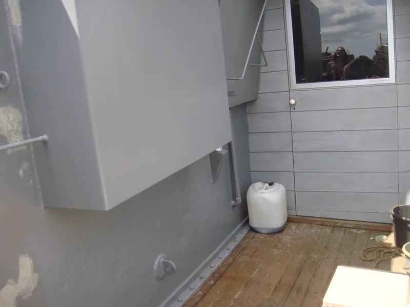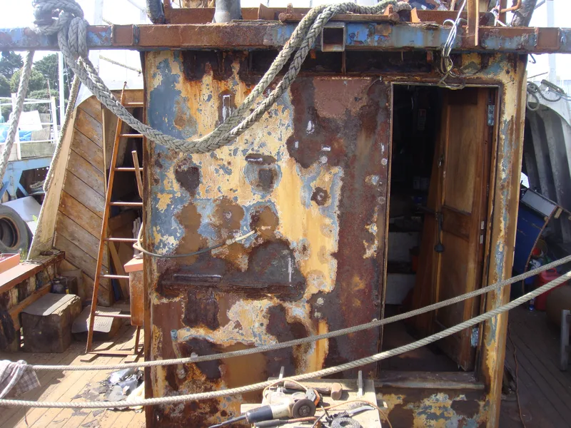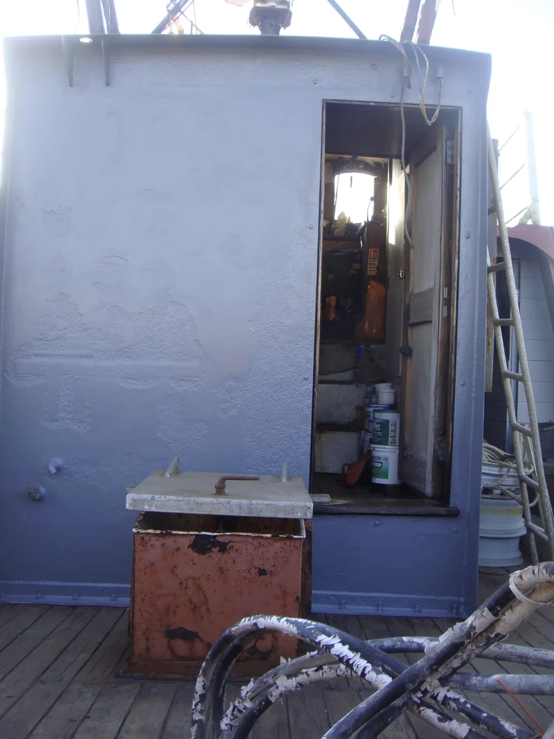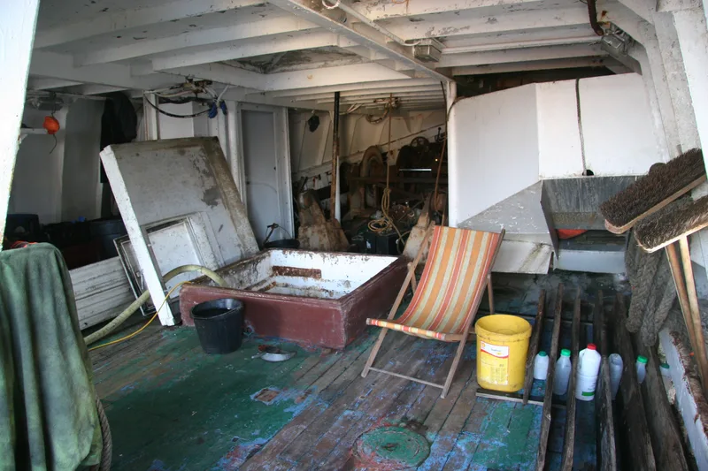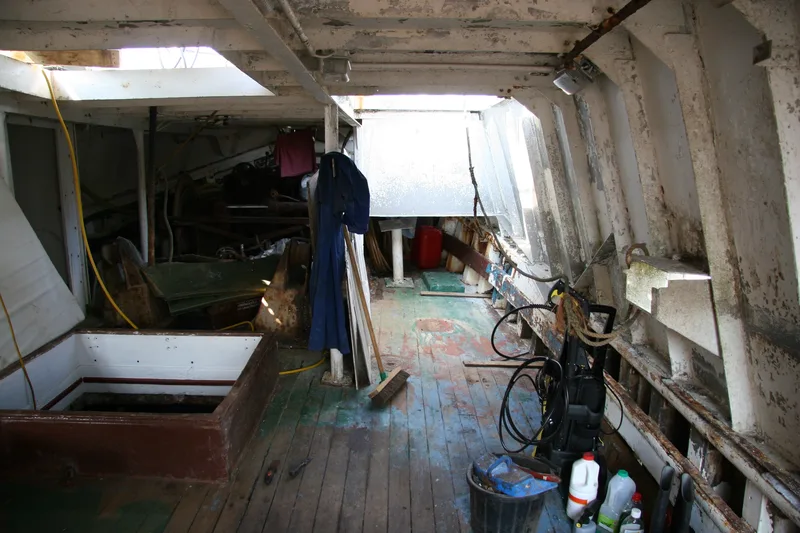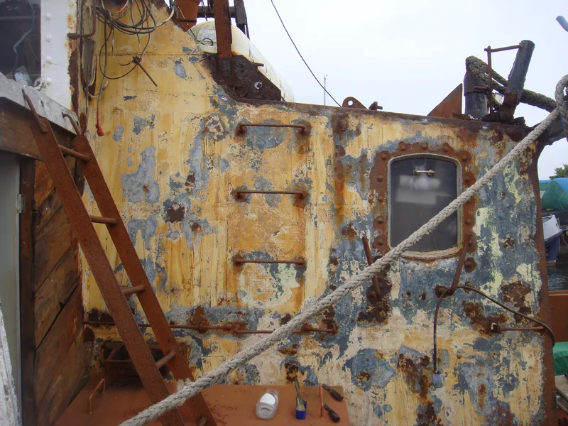 I had already stripped back the old layers of paint and rust from the wheelhouse so I started by priming that. I also started stripping, repairing and priming the one side of the boat I could safely get to. I removed more of the old iron gubbins from the decks which were a hangover from Albacore’s trawler days and I put most of my personal belongings in to a storage container to - (literally!) - clear the decks so I could begin work on the interior.