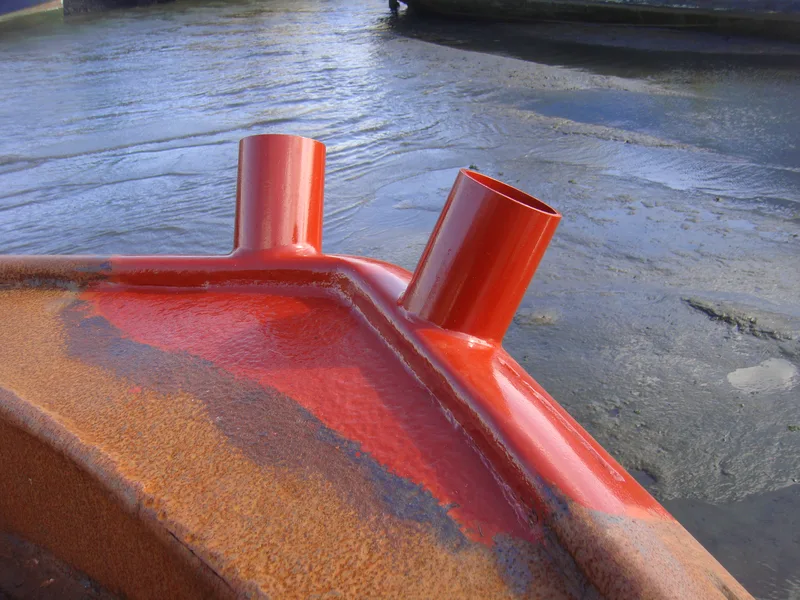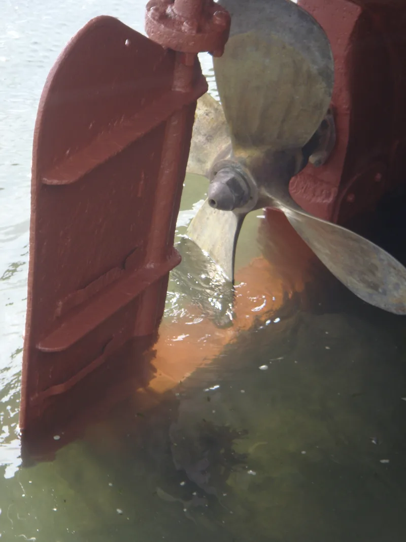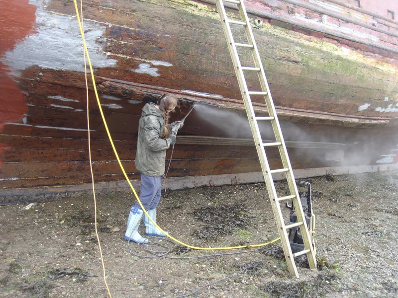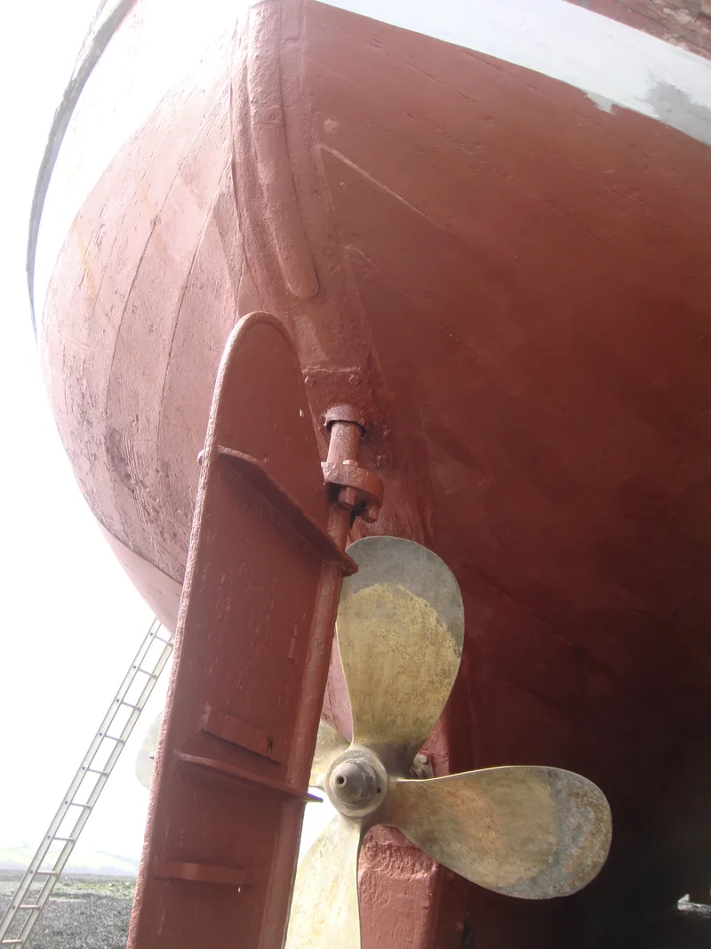 With Albacore leaning port side out, we did everything we could to get her as close to finished with her in this position, including the rudder, the propeller, the white stripe denoting the water line and as much as we could possibly, physically get to on the starboard side against the sea wall. Being just that bit shorter and a bit more flexible than Tim, I was able to reach quite a lot of it in that dark, narrow space, but even so, claustrophobia was beginning to tighten its grip on me and at some point we had to make the decision to turn her around so we could safely access the starboard side.