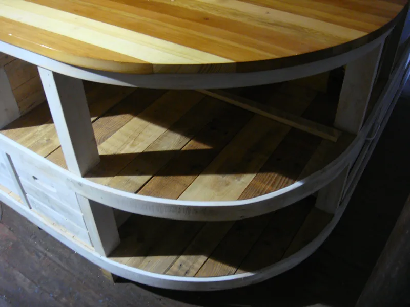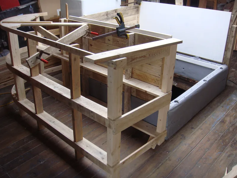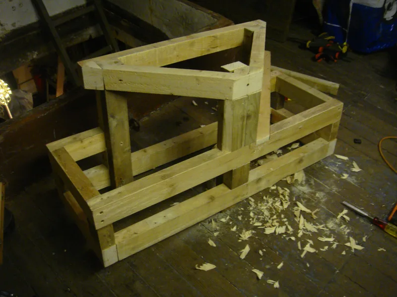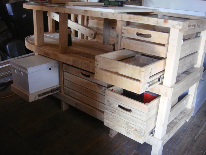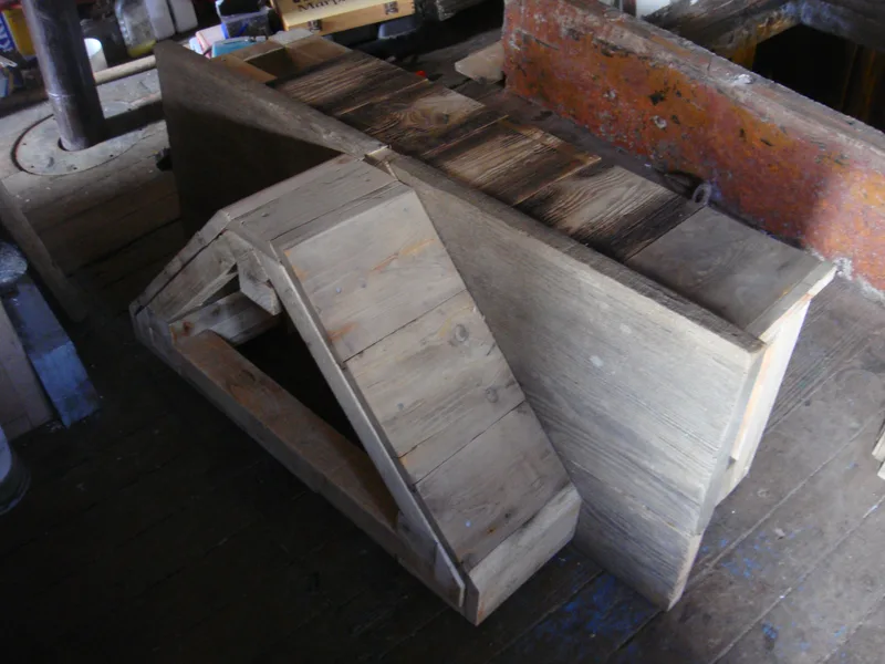 I started by building 2 doors on the shelter deck as that part of the ‘interior’ had always been open to the elements. I then removed the old metal hatch which led down via a ladder to the fish hold so I could build a fancy new wooden staircase and hatch. I was going to need a lot of wood for building and fortunately I managed to salvage a massive stack of pallets.