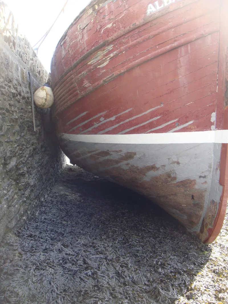 We had some friends of ours from the boatyard, Jenny and Geoff, bring their small boat over to help us turn Albacore on the next high tide. With their help, it was a simple enough manoeuvre but with Albacore now facing ‘downhill’ on the low tide, she was leaning even more precariously on the wall at a horrible, uneasy angle.
