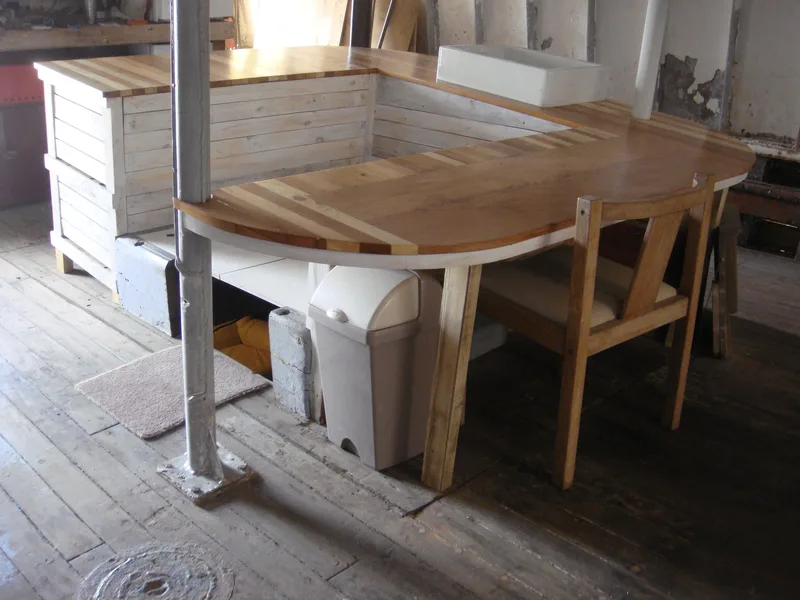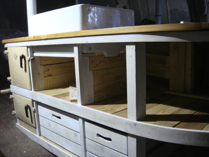 I built the kitchen, or galley, around the hatch which was in the centre of the deck, creating a sort of island kitchen with a hole in the middle which led down to the bedroom and bathroom - (the old fish hold) - via the new wooden staircase. It doesn’t always make life easy, this urge to do things the hard way, but why take the easy route when you can create something so much more interesting and creative?