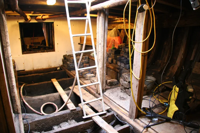 To minimise the time she was in this position, we needed to work really fast. There were just a couple of days until the tide would be high enough to float her back to the safety of the boatyard and we really didn’t want to miss that window. Unfortunately, the weather was really against us. It was windy and the rain was relentless. At one point it rained so hard and so fast that water poured in to the upper deck and flooded the interior. Because of the angle of the slope we were sitting at, there was absolutely nothing we could do to stop it. All we could do was stand there and look at each other as the rain flowed through the boat, trying not to cry and reassuring each other that it would be okay. It was a horrible moment.