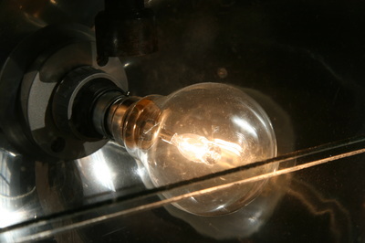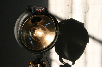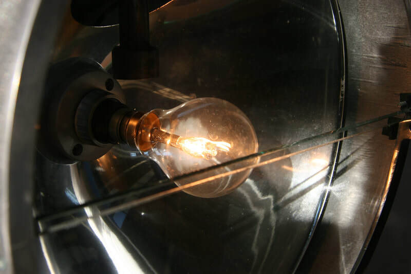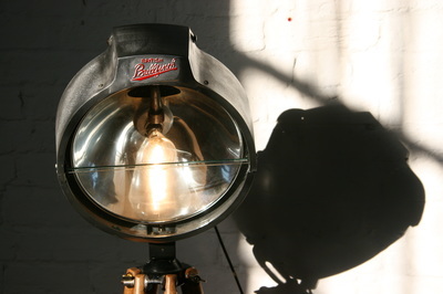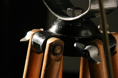 I then fitted it with a new CE marked bulb holder, painted silver to match and, using an old tap handle for a switch, I also fitted a dimmer. I then mounted the lamp on to a restored surveyor's tripod. These two items, sourced separately, I have designed and rebuilt to appear as one piece.