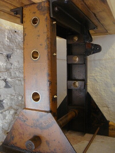 Well, this turned out to be considerably more difficult than I might have hoped due not least to the fact that the winch was insanely heavy, but being an Upcycler with a good eye and a large reserve of determined optimism, we persevered, removing the winch piece by weighty piece. One lengthy dismantly later I had a cup of tea and the winch in its many greasy parts. My initial intention was to keep some of the original gears in situ as part of the piece but on throughly cleaning the main frames and seeing the three holes with their bearings still in place, I decided to leave it bare. I'm sure the gears will come into their own in another project.