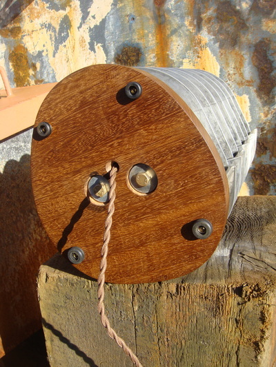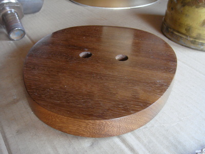 As is often the case, however, I kept the piece for a long time before deciding to turn it into a lamp. (A lot of the things I find become lamps and I sometimes wonder if it's a case of 'when your pottery goes wrong, you get another ashtray'). Just the thing on its own seemed enough, but after much cleaning and polishing I decided that a lamp it would become, so I fitted it with all new electrics, an energy saving CFL bulb and some complementary brown cotton twist flex with black inline switch and a black plug. Finally, I made a mount for it from a beautiful piece of hardwood which I waxed and polished and fitted with rubber feet ...